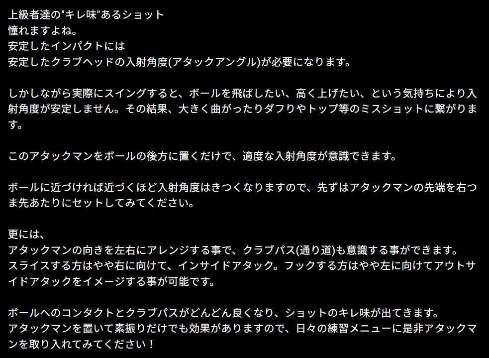・アタックマンの向きを左右にアレンジすることで、クラブパス(通り道)を意識することができます。